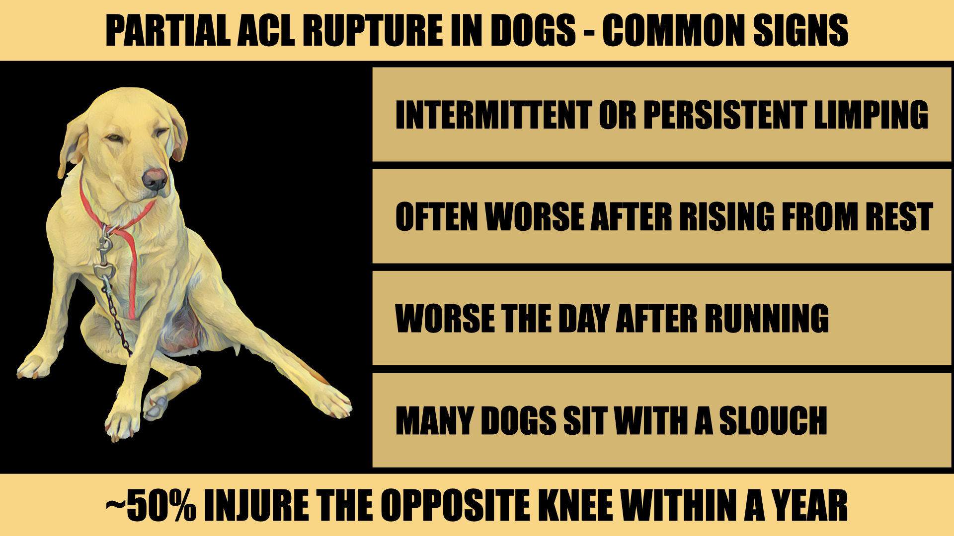 ACL injuries in dogs are more common after normal exercise than trauma. Periods of intermittent improvement are expected. Unfortunately, these respites don't imply a good chance of returning to normal. Two-thirds of injured dogs receive surgery and 50% injure the opposite knee within a year.